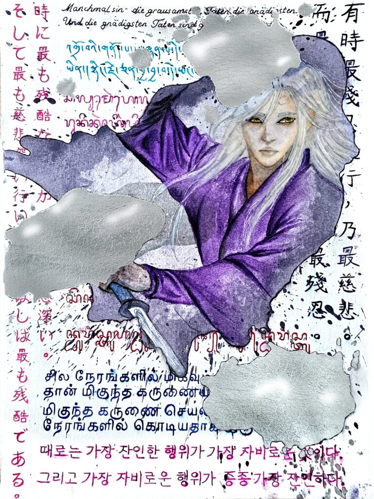Meine Tochter hat diesmal Blattsilber anstatt Gold verwendet , was dem Bild einen hellen aber kalten Zauber verleiht. Ich finde , beide Bilder selbst , das mit Blattgold und das mit Blattsilber stehen zueinander wie Yin und Yang.