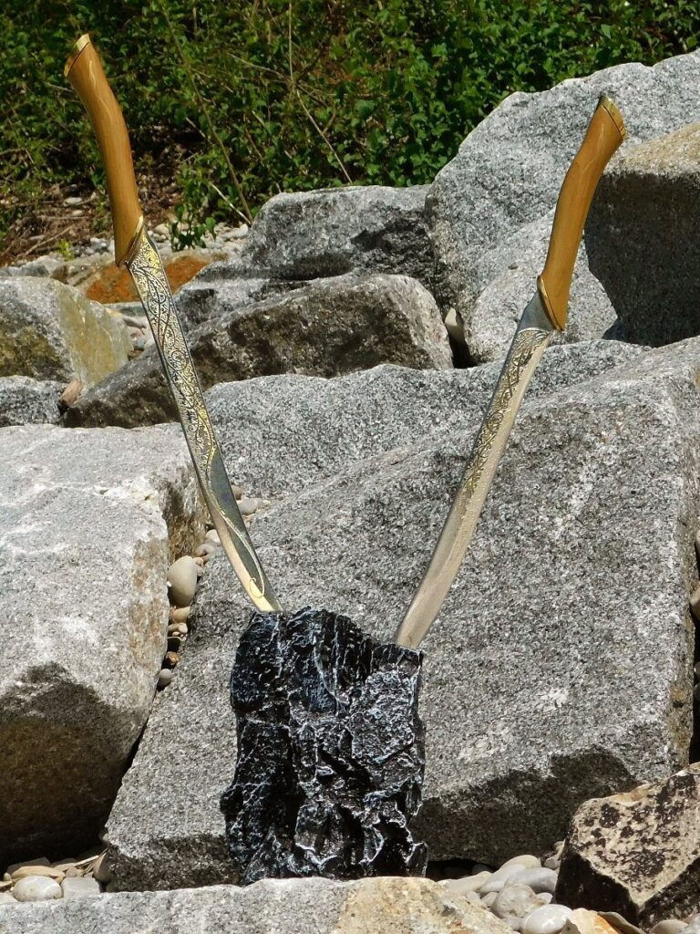 Ich suchte auf amerikanischen Seiten und habe die Dolche von Legolas gefunden. Elegant mit wunderschöner Gravur. Sie haben ein gutes Gewicht und die richtige Länge.