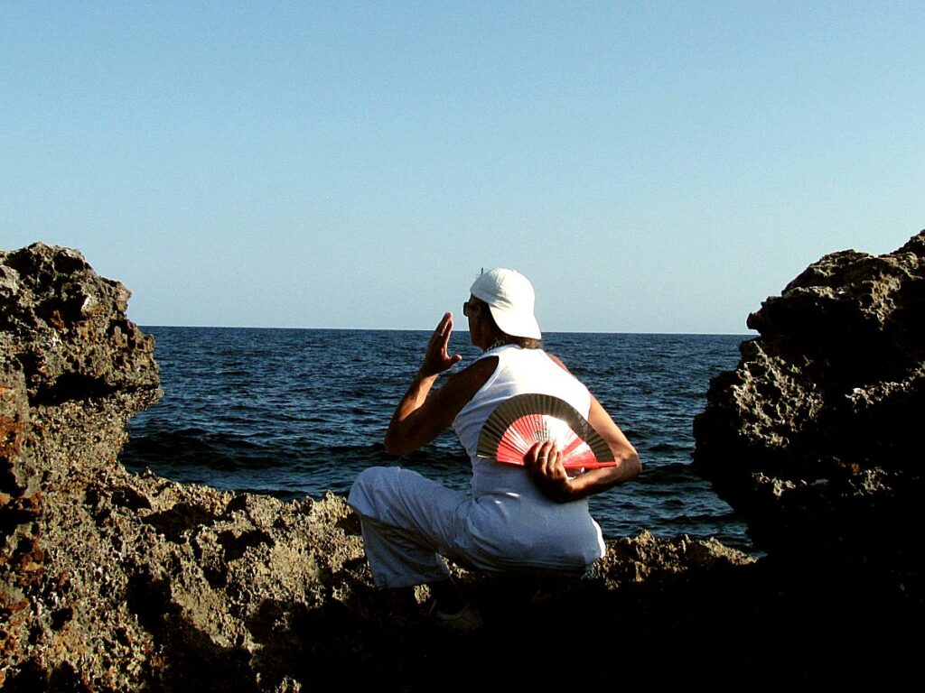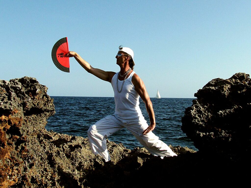 Meist sind es kreisförmige Schrittfolgen und Bewegungen, mit aufgeklappten Fächer. Es scheint so, als wolle man mögliche Gegner auf Abstand halten. Frau will erst gar nicht angegriffen werden. Gleichzeitig führen die kreisförmigen Bewegungen dazu, dass Tai Chi mit dem Fächer sehr geschmeidig und elegant wirkt.